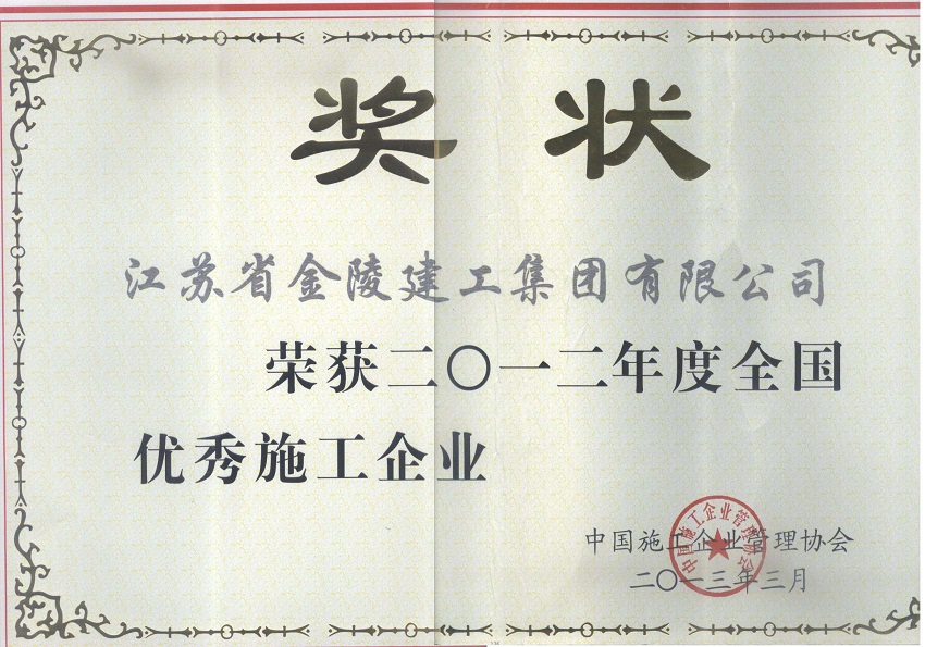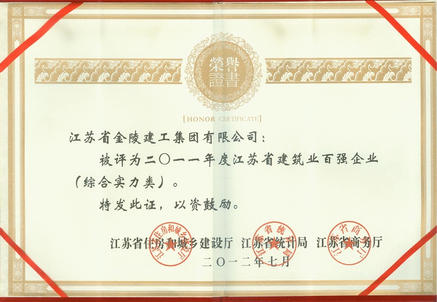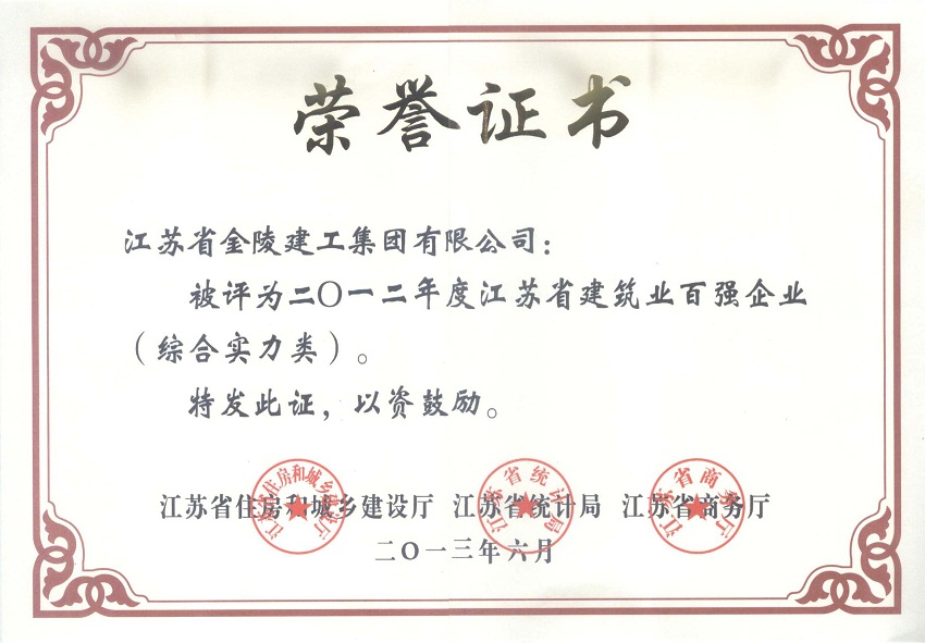 2012年江蘇省建筑業(yè)百強企業(yè)(綜合實力類)證書