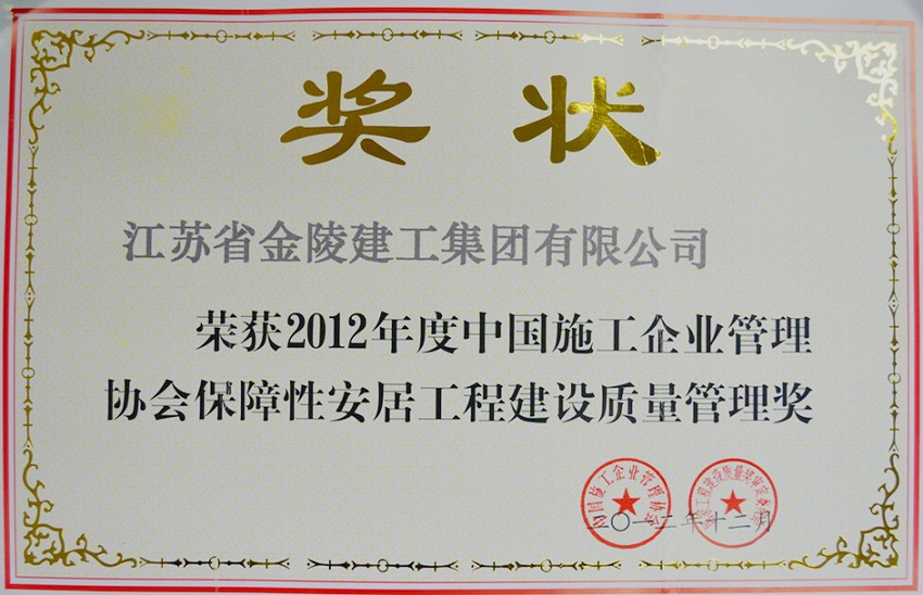 2012年度保障性安居工程質(zhì)量管理獎獎狀