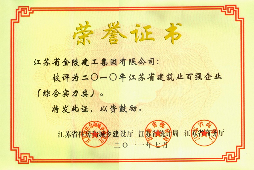 2011年江蘇省建筑業(yè)百強企業(yè)(綜合實力類)證書