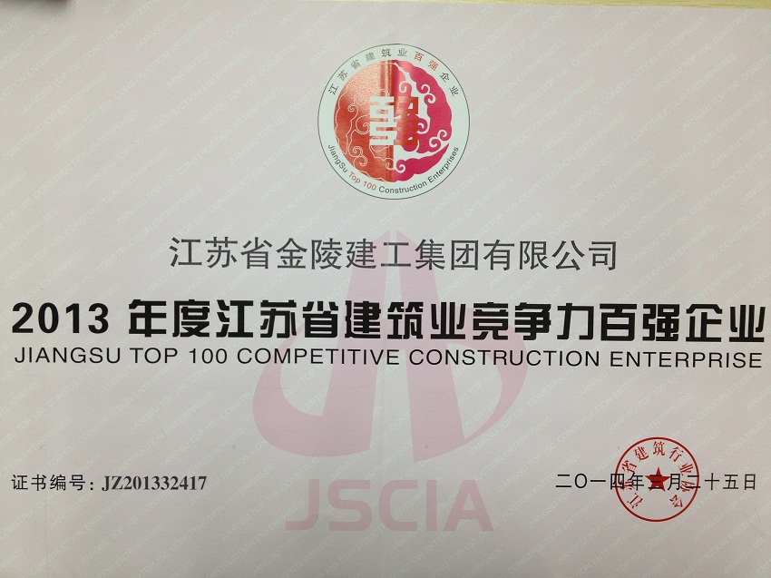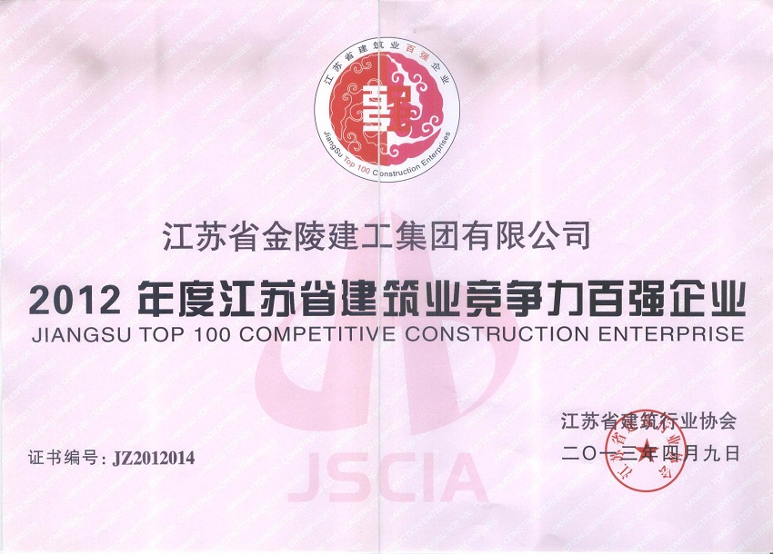 2012年度江蘇省建筑行業(yè)競爭力百強企業(yè)證書