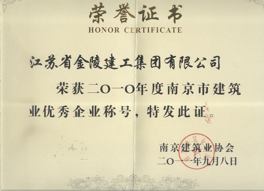 2010年度南京市建筑業(yè)優(yōu)秀企業(yè)證書