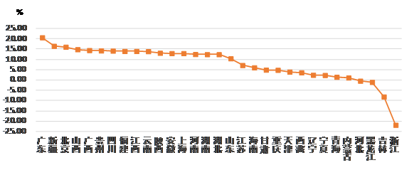 從各地區(qū)建筑業(yè)總產(chǎn)值增長情況看,有 27 個地區(qū)的建筑業(yè)總產(chǎn)值較上年同期有不同幅度的增長。其中,廣東、新疆、北京的增幅均超過 15%。有 4個地區(qū)出現(xiàn)負增長,其中,浙江出現(xiàn)了 超過20% 的負增長(圖 2)。
